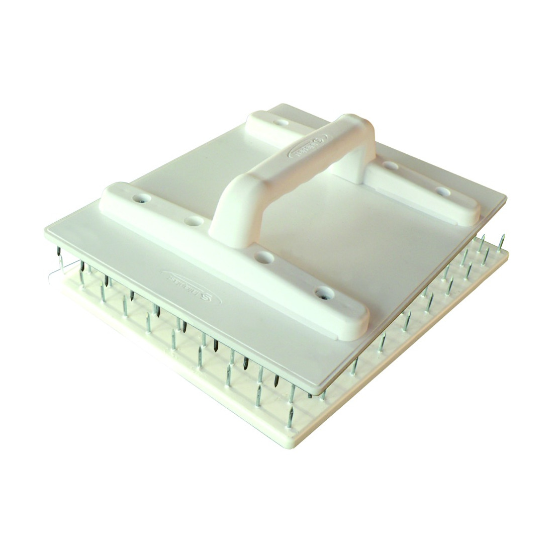 Poignée en polypropylène ergonomique et renforcée pour assurer une planéité latérale parfaite. Plateau inférieur injecté en PS Choc avec rainures intérieures pour garantir la planéité longitudinale. Longueur des pointes 19 mm.